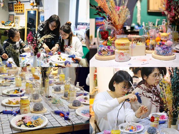 活動現場,花藝師就如何安放主花、固定花瓣、插花造型等步驟和技巧等進行了詳細講解。大家選擇好心儀的花材,充分發揮創意和想象力,精心將每一朵花、每一片葉插放和鋪貼,使原本樸實無華的花托瞬間花團錦簇、生機盎然。活動中,大家你瞧瞧我的,我看看你的,相互交流搭配心得,在歡聲笑語中完成了一份份精美且獨一無二的永生花作品。大家手捧親手制作的永生花合影留念,定格美好瞬間。